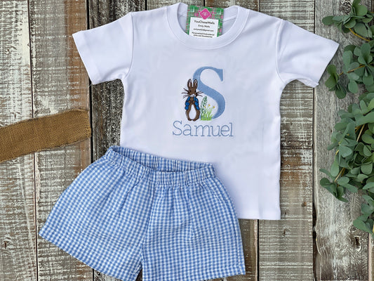 Custom Embroidered, Monogrammed, Personalized Peter Rabbit Letter Shirt and Blue Seersucker Gingham Short Set
