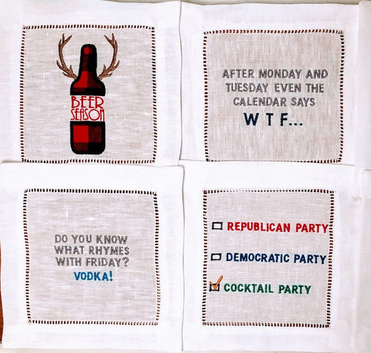 Custom Embroidered, Personalized Whimsical Linen Cocktail Napkins Set of 4