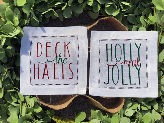Custom Embroidered, Holly and Jolly, Deck the Halls, Merry and Bright, Peace on Earth Holiday Cheer Linen Hemstitch Cocktail Napkins Set of 4