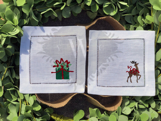 Holiday Embroidered Linen Hemstitch Cocktail Napkins Set of 4