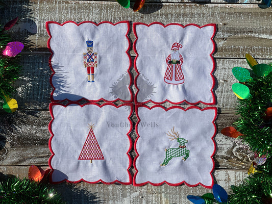 Holiday Scalloped Cocktail Napkin Set, Christmas Cocktail Napkins, Chinoiserie Linen Cocktail Napkins, Santa, Nutcracker, Deer, Tree, Napkin