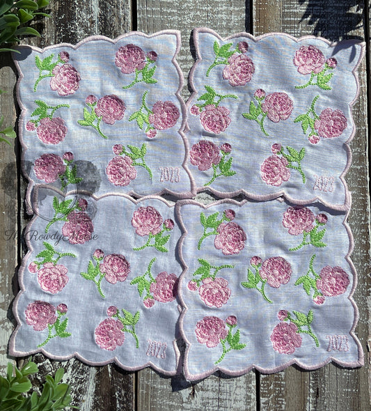 Custom Embroidered, Personalized Scalloped Linen Cocktail Napkin Set of 4