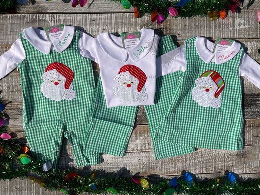 Custom Embroidered, Santa Applique Green Gingham Jumper Dress, Longall, Shirt, Shirt & Pant Set