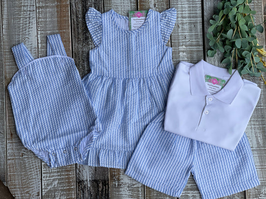 Custom Embroidered, Personalized, Monogrammed Light Blue Seersucker Bubble, Jon Jon, Flutter Dress and Polo Shirt Set