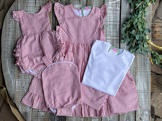 Custom Embroidered, Monogrammed, Personalized Sparkler Trio Red Seersucker Bubble, Flutter Dress, Shirt Short Set, Ruffle Bubble