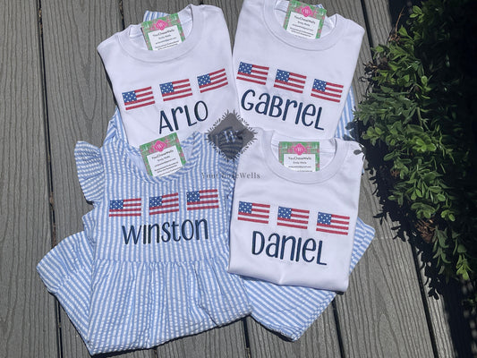 Custom, Embroidered, Monogrammed, Personalized American Flag Cross Stitch Trio Light Blue Seersucker Bubble, Jon Jon, Flutter Dress, Shirt and Short Set