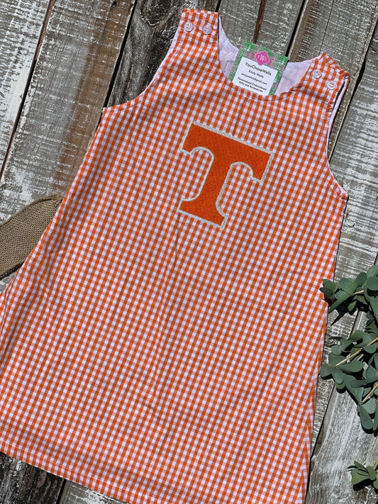 Custom Embroidered, Personalized T Game Day Orange Gingham Longall, Ruffle Longall, and Jumper Dress