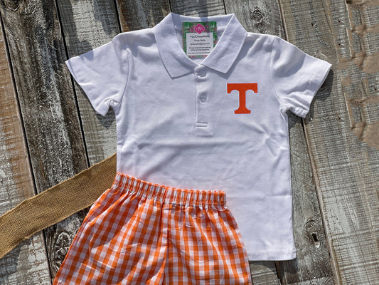Custom Embroidered, Monogrammed, Personalized Game Day Hound with Football Applique Shirt and Orange Gingham Short Set