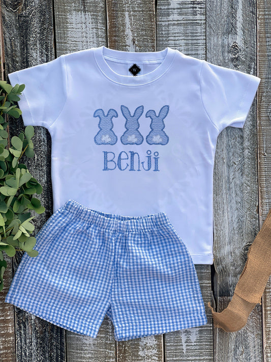 Custom Embroidered, Monogrammed, Personalized Bunny Trio Sketch Shirt and Blue Seersucker Gingham Short Set