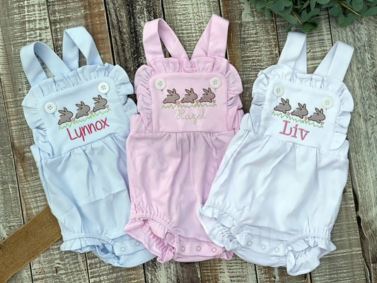 Custom Embroidered, Monogrammed, Personalized Bunny Running Trio Sketch Ruffle Pink, White, or Blue Bubble