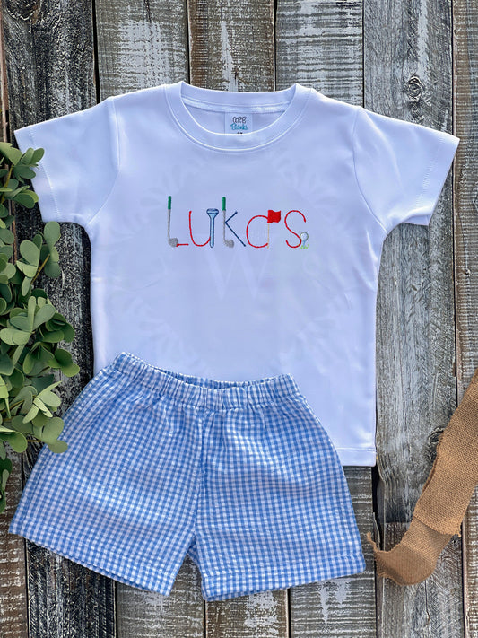 Custom Embroidered, Monogrammed, Personalized Golf Name Shirt and Red, Navy, and Blue Seersucker Gingham Short Set