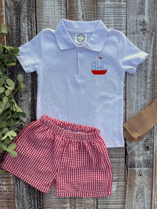 Custom Embroidered, Personalized Sailboat Monogram Polo Shirt and Red or Blue Seersucker Gingham Short Set
