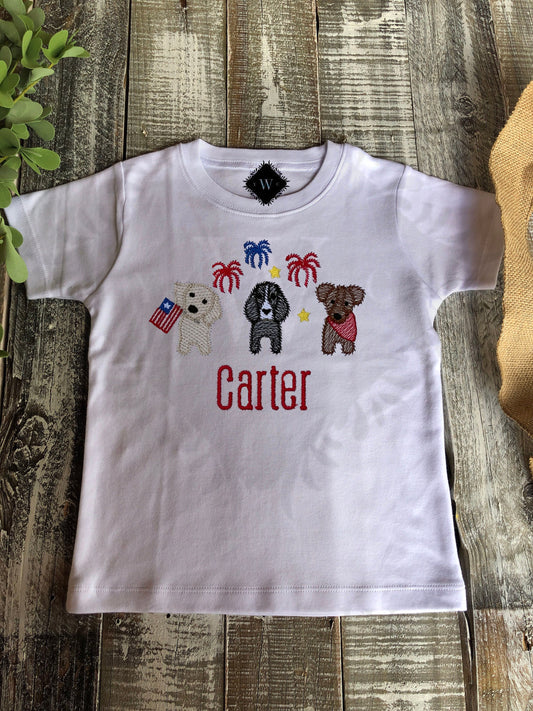 Custom Embroidered, Monogrammed, Personalized Patriotic Dog Trio Sketch Shirt and Navy Seersucker Short Set