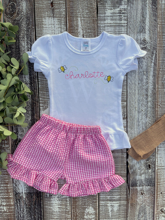 Girls/Baby Bees Monogram Shirt with Ruffle Shirt and Pink Seersucker Short Set