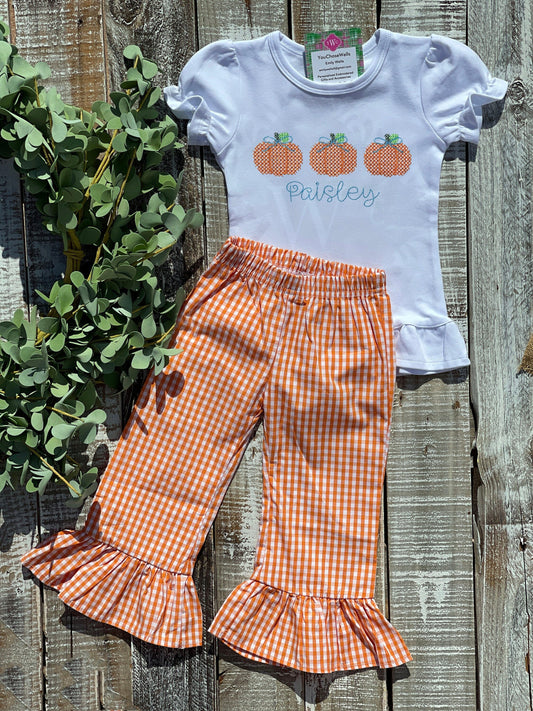 Custom Embroidered, Monogrammed, Personalized Pumpkin Trio Cross Stitch Ruffle Shirt and Orange Gingham Pants