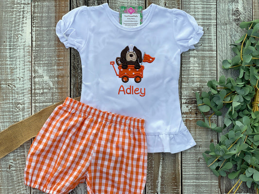 Custom Embroidered, Monogrammed, Personalized Game Day Hound with Football Applique Shirt and Orange Gingham Short Set