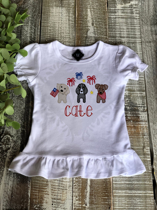 Custom, Embroidered, Monogrammed, Personalized Patriotic Dog Trio Sketch Ruffle Shirt and Red Gingham Seersucker Short Set