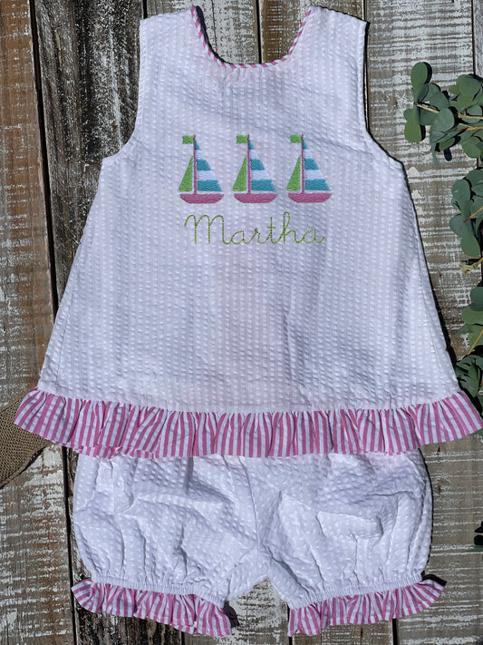 Girl, Sailboat Trio, Pink Seersucker Swing Back Set, Pink and White Seersucker Ruffle Bubble, Preppy, Embroidered, Sibling Outfit, Summer