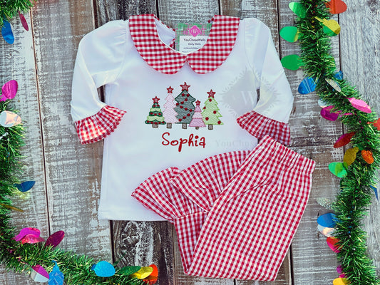 Custom Embroidered, Monogrammed, Personalized Christmas Tree Bundle Red Gingham Shirt and Red Gingham Pants