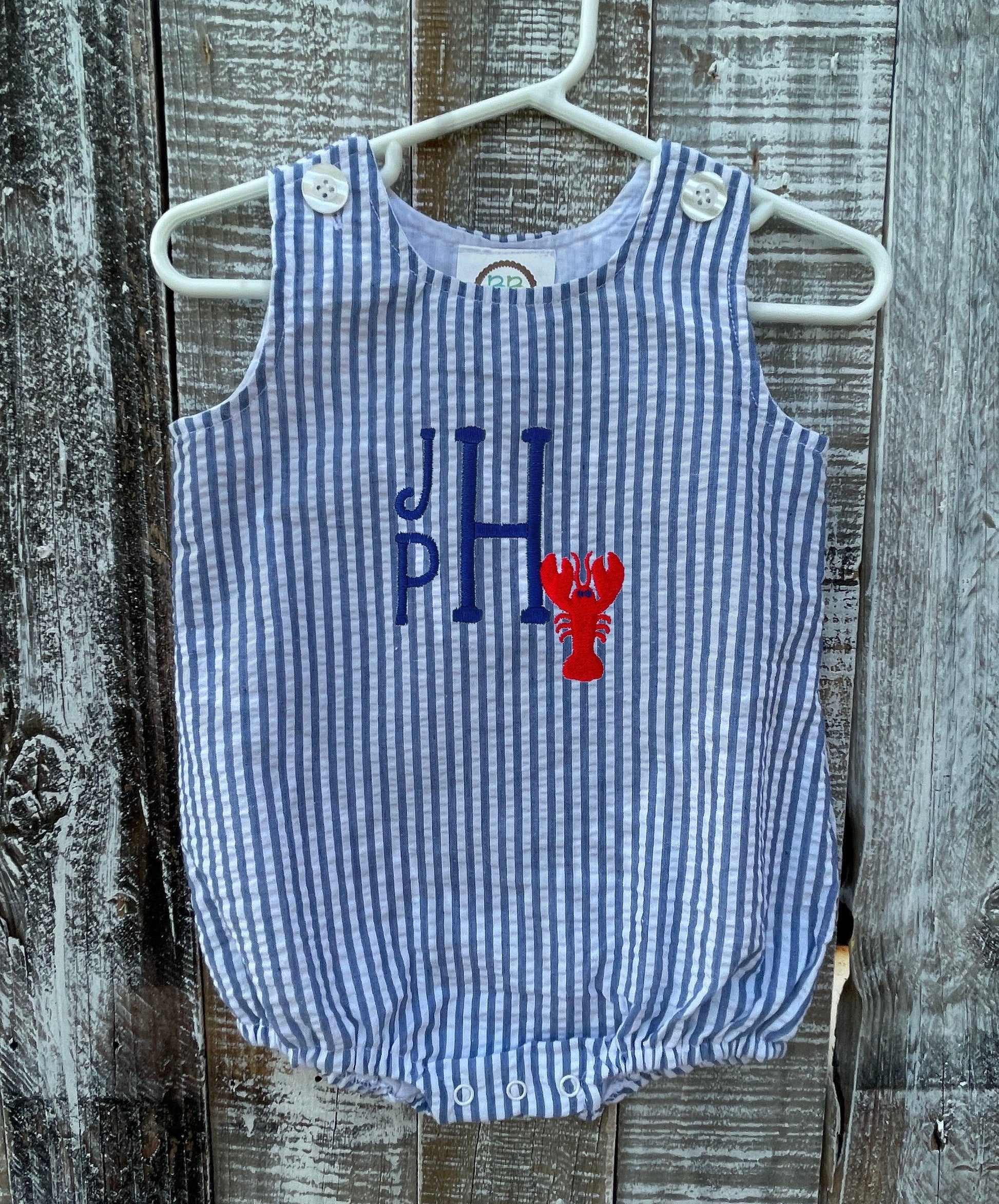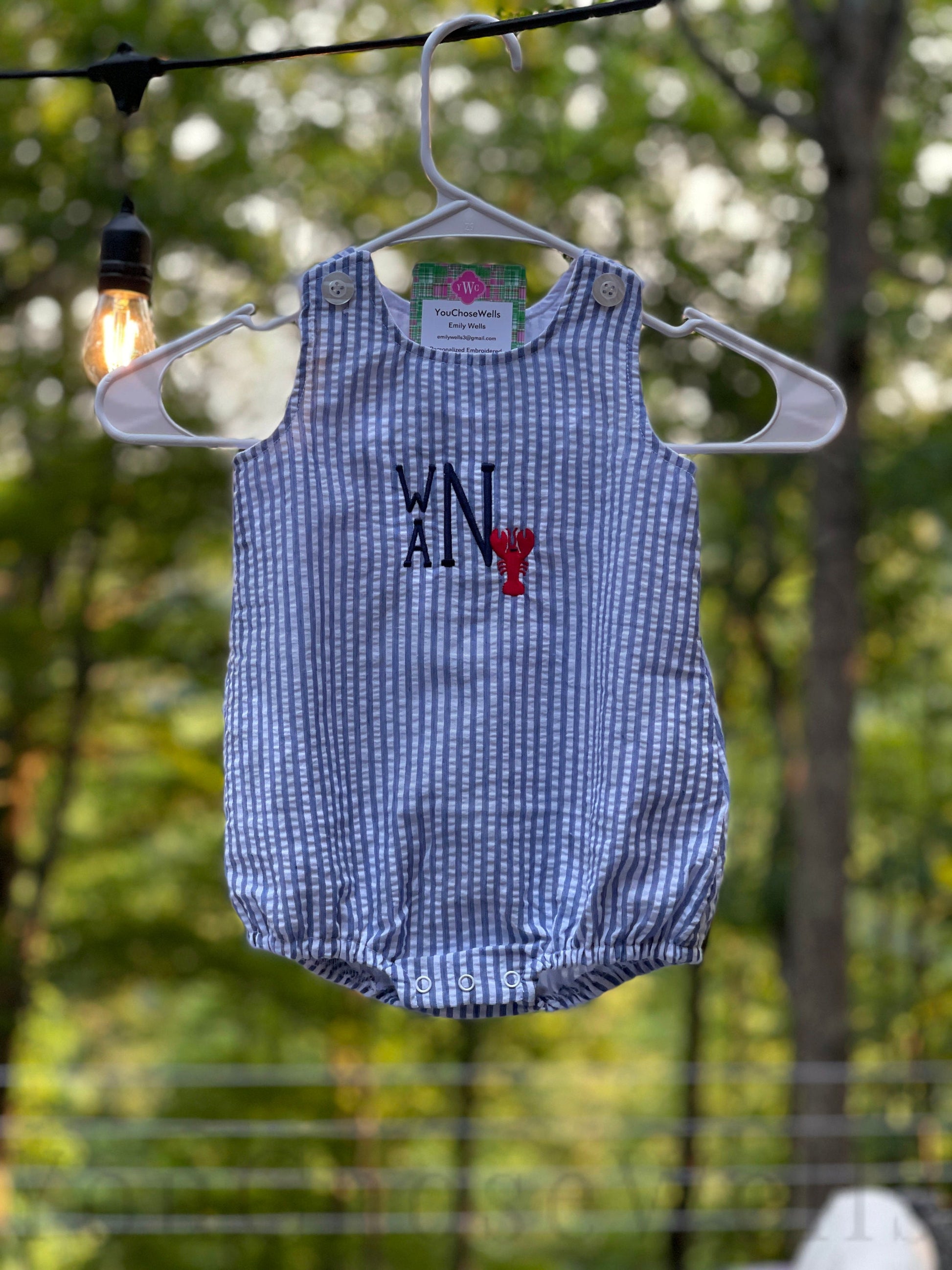 This Navy Seersucker Bubble is perfect for hot, summer days! Would make an adorable baby shower gift. Comes with Baby's initials and lobster.
