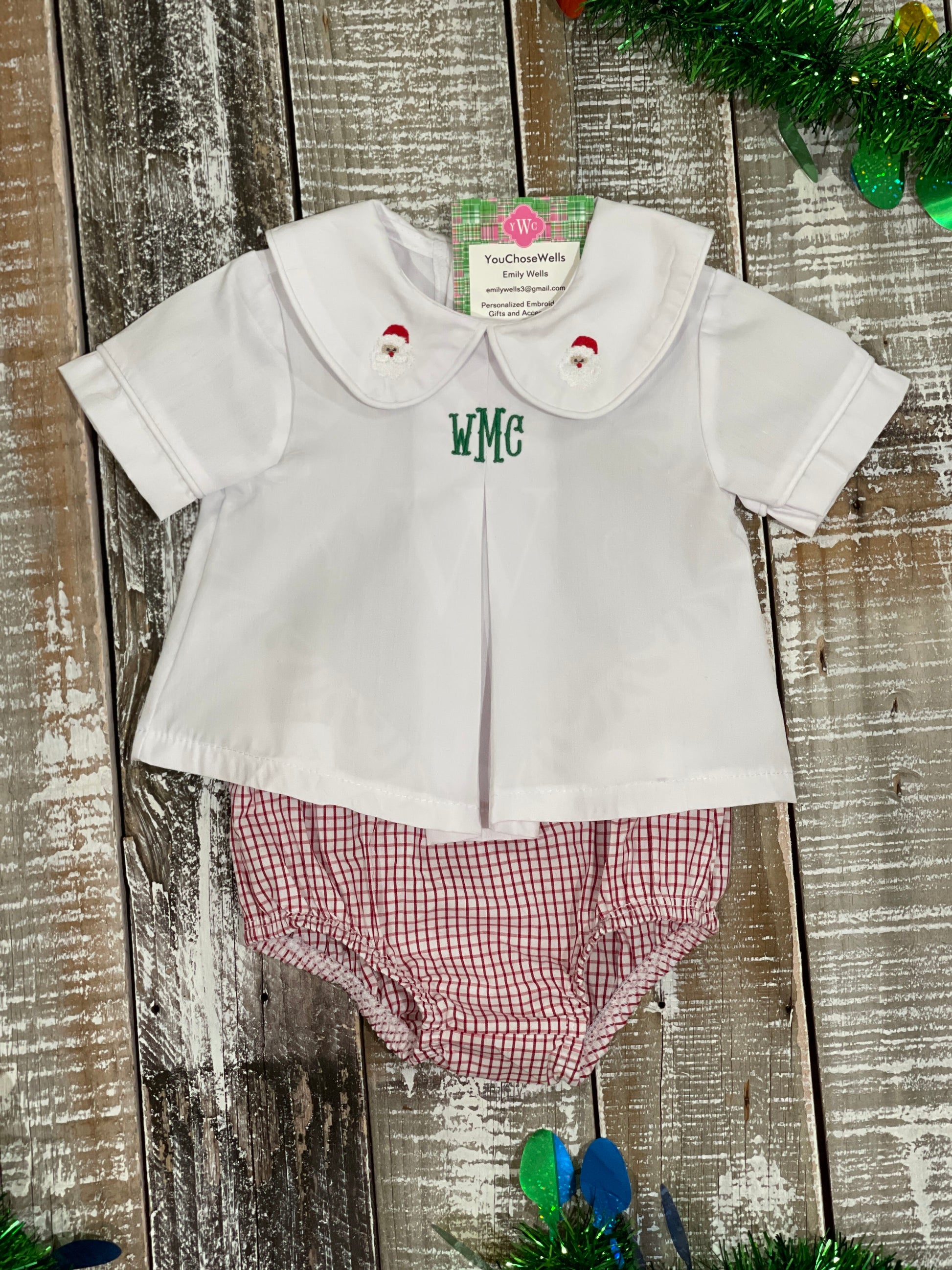 Spread some holiday cheer with these adorable personalized Pleated Peter Pan Collar Shirts and Diaper Covers! It is the perfect outfit for pictures with Santa, holiday get togethers, and family gatherings!