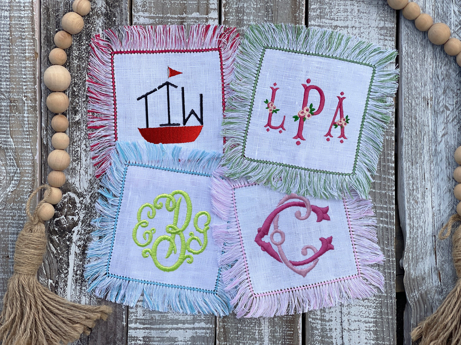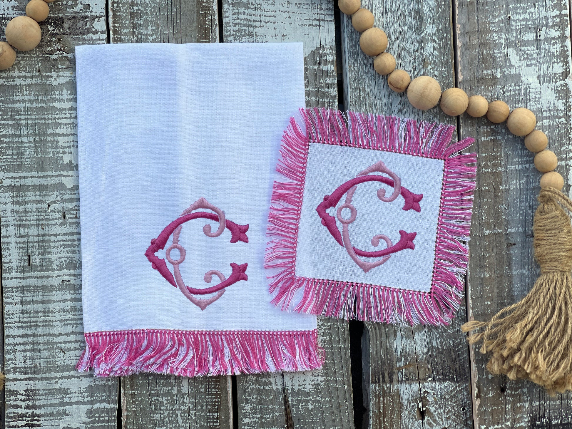 Fringe cocktail napkins, the only thing better than one cocktail is two! Embroidered, linen cocktail napkins are custom made for you and yours for every toast-worthy moment.