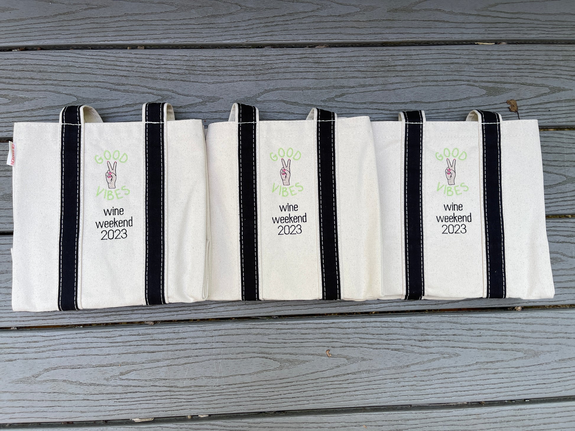 I received my wine tote bag as a gift and it is absolutely fantastic. It is super strong and can easily hold 4 bottles of wine. The material is very durable and the embroidery that was used to personalize it is so adorable! I will get a lot of use out of this tote!