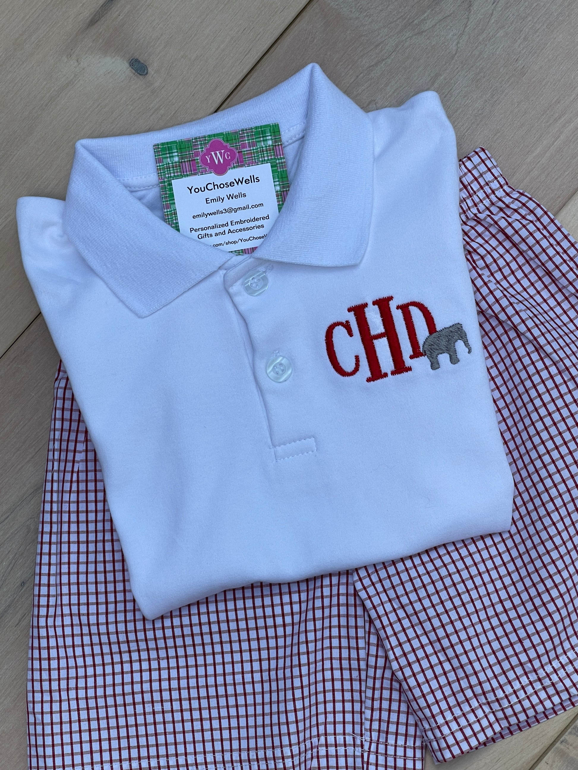 Custom Embroidered, Monogrammed Elephant Windowpane Bubble, Polo Shirt and Short Set, and Polo Shirt and Bloomer Set
